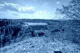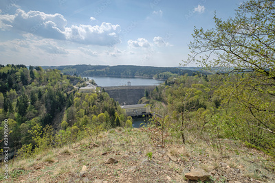 Blick zur Staumauer der Bleilochtalsperre an einem sonnigen Tag im Frühling