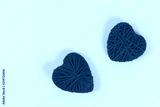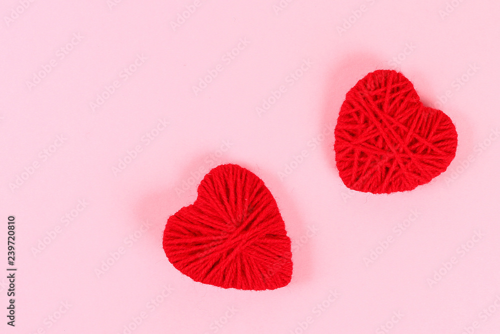 Valentine day layout. Red homemade diy hearts made of cardboard and yarn on a pink background. St. Valentines Day idea, day love, February 14 concept. Copy space, top view, flat lay composition.