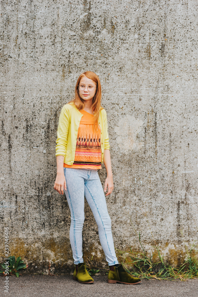 Outdoor portrait of pretty little girl with red hair, wearing orange t-shirt and yellow jacket