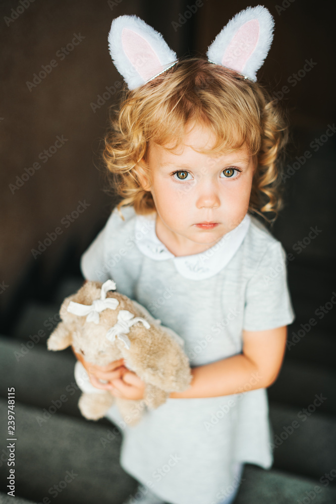 Portrait of adorable toddler girl wearing bunny ears, holding soft bunny toy