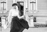 Outdoor fashion portrait of young beautiful woman wearing red beret, belt, turtleneck, polka dot blue midi skirt, holding small white leather bag, posing in old european street. Copy, empty space