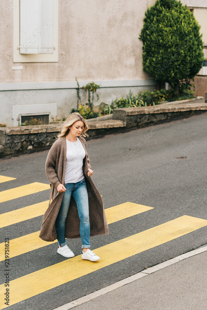 Fashion woman crossing the roadm wearing long knitted cardigan