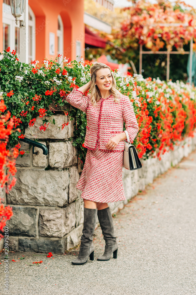 Retro style portrait of beautiful woman with blond hair, wearing red and white plaid blazer