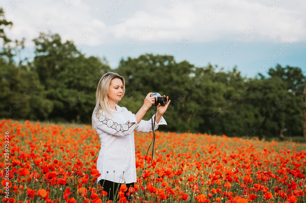 Beautiful woman photographer enjoying amazing day at poppy field, holding vintage film camera