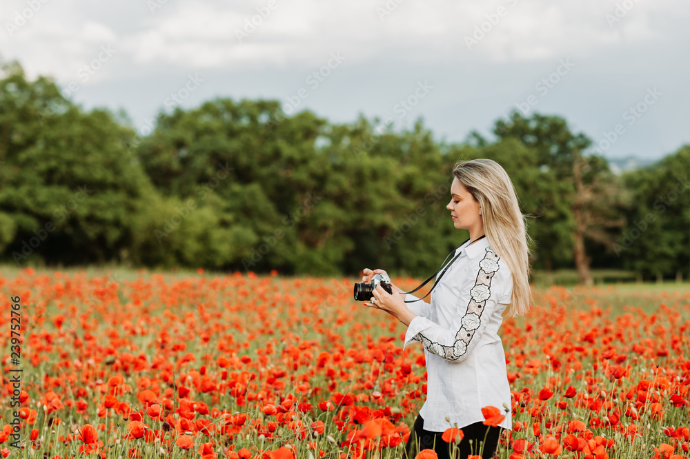 Beautiful woman photographer enjoying amazing day at poppy field, holding vintage film camera