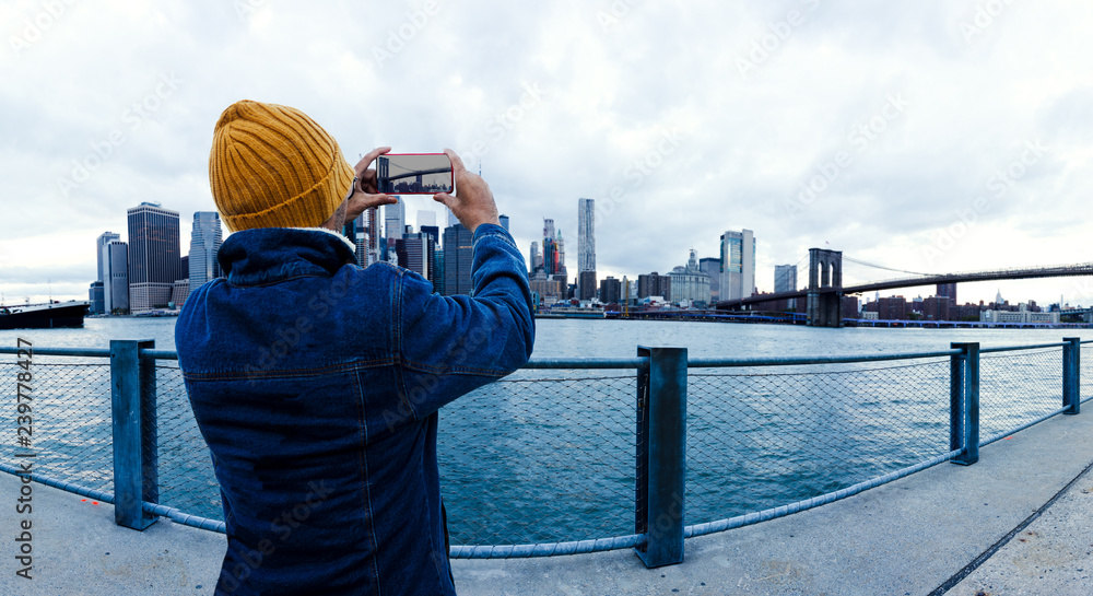 Asian traveler taking photo with mobile phone in Brooklyn bridge at sunset. New York city.