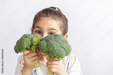 Happy smiling child girl eating vegetables. Healthy food. Fresh broccoli.