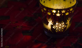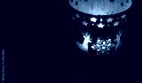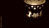 Christmas candle holder alight with a holdiay red glow, depicts scenes of winter and snow by the flame within.