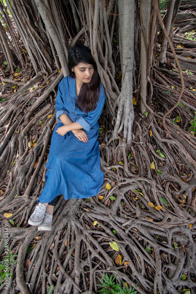 Fashion girl outdoor portrait, Asian woman walking in the park.