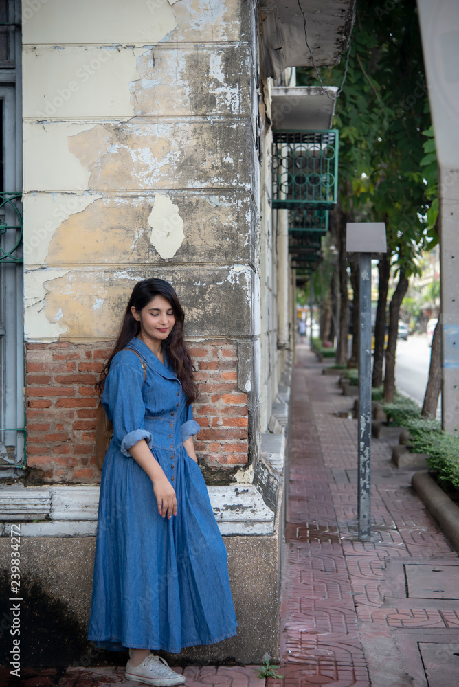 Portrait of beautiful asian woman wearing blue dress walking on street.