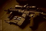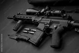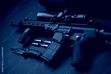 modern automatic rifle with an optical sight lies on a dark background and next to the knife and ammunition