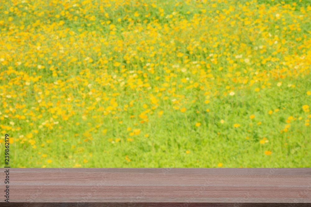 Wooden table with blur yellow flowers field background