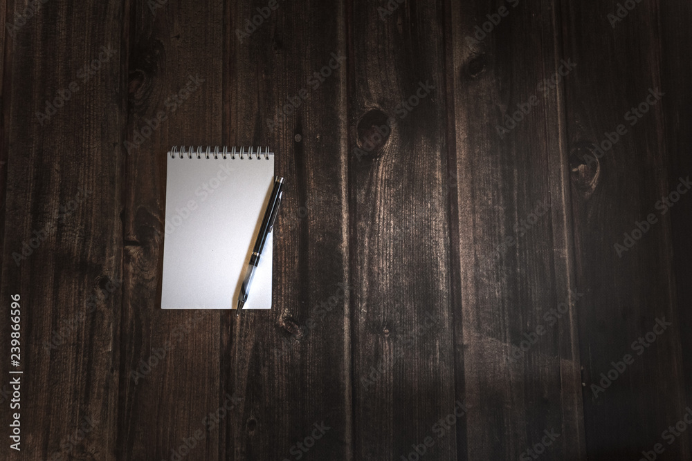 clear white notepad with black pen on wooden table, workplace for education, space for text