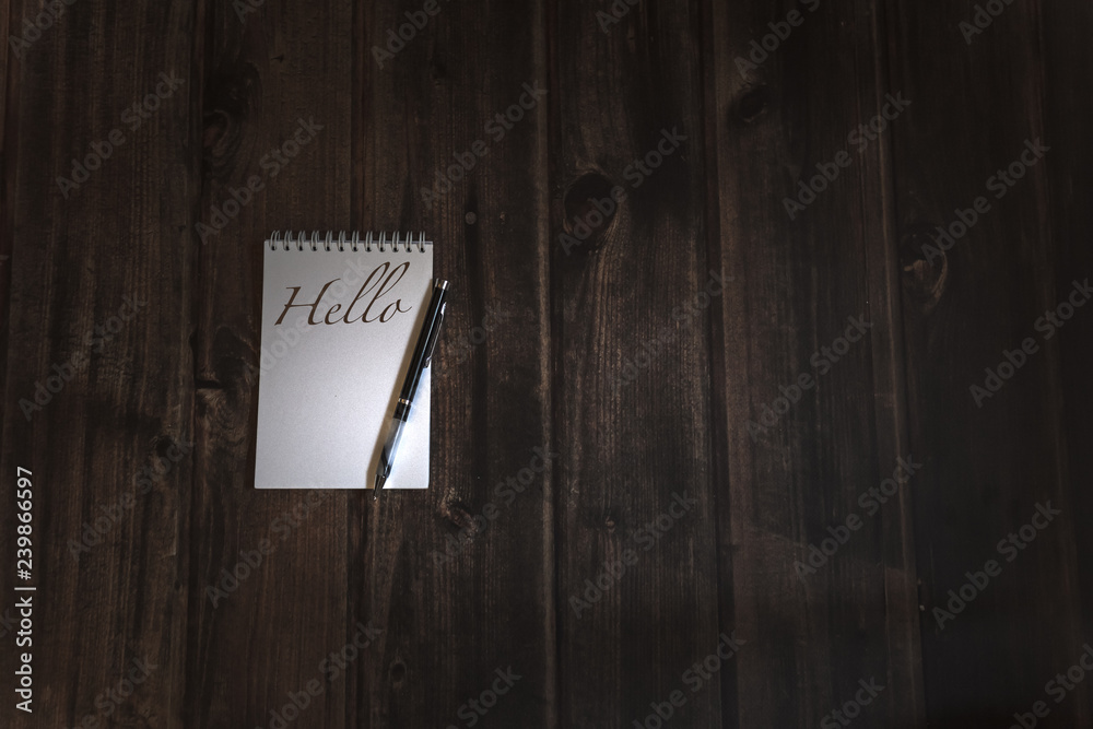 "hello" writing on lear white notebook paper by black pen, wooden rustic table, message handwritten