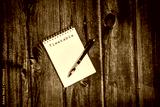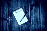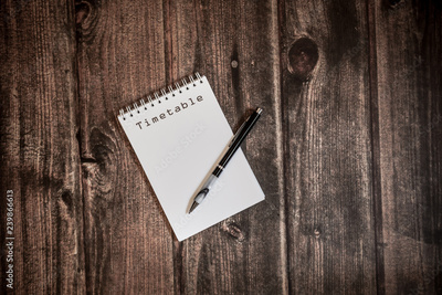 "timetable" on notebook for memo and plan, notepad for organise a day, space for text, rustic table
