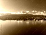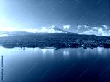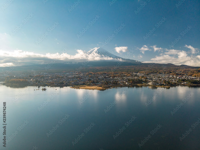 Aerial view over lake Kawaguchi, located in the border Fujikawaguchiko and Minobu, southern Yamanashi Prefecture near Mount Fuji, Japan. Lake Kawaguchi is a very popular tourist spot near Fuji Japan.