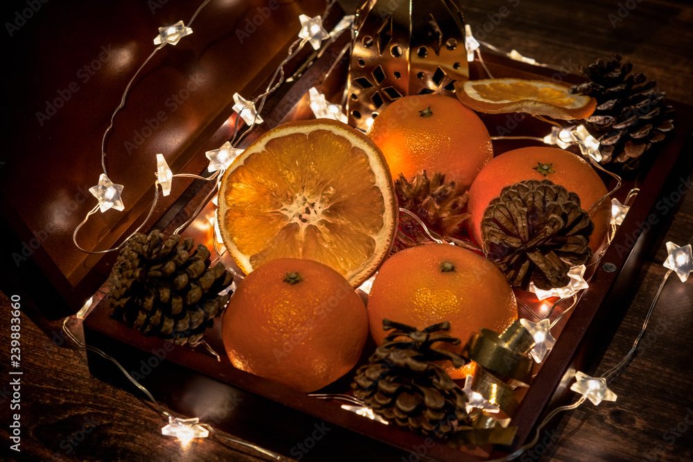 dark wooden box with Christmas items: oranges, cones and garland, gift box for wonderful festive evening and night, romantic New Year celebration