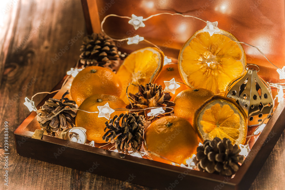 Oranges and brown cones, dried oranges, light garland in brown vox, Christmas and New year present