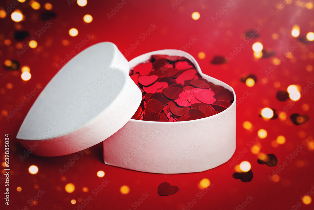 Heart shaped gift box with heart confetti. Passion, love and feelings St Valentine's celebration concept with copy space
