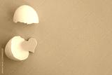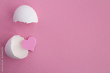 Pink heart and the white eggshell on the pink background.Top view.Copy space.
