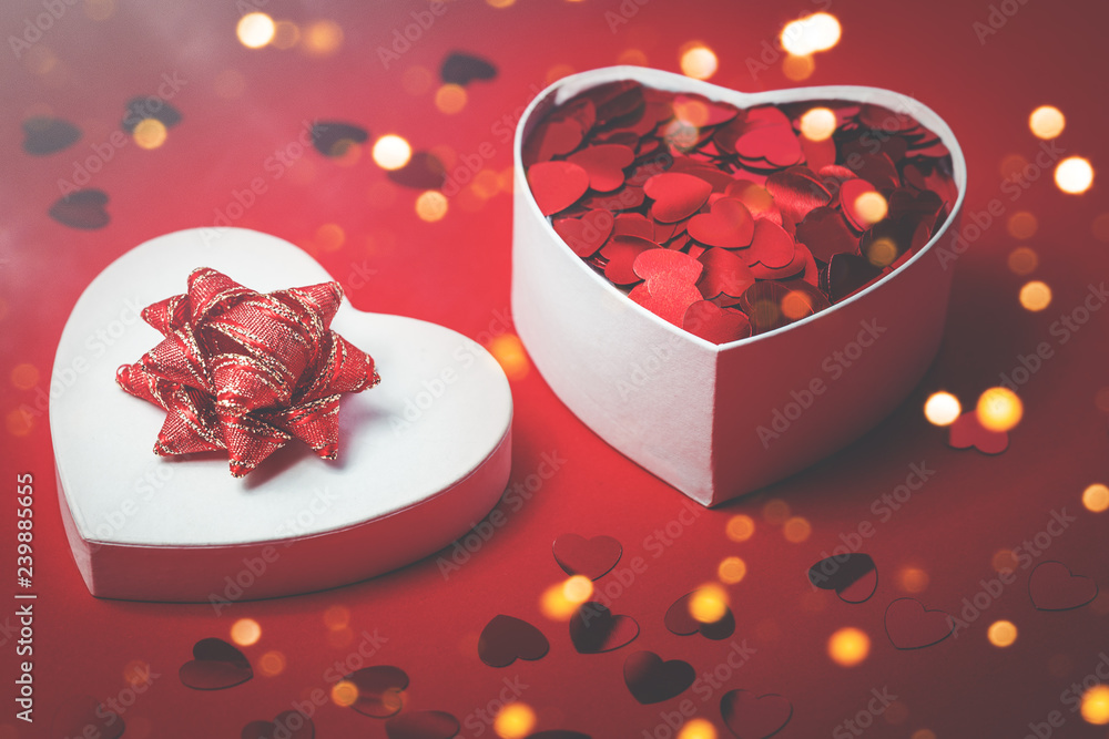 Heart shaped gift box with heart confetti. Passion, love and feelings St Valentine's celebration concept with copy space