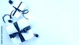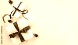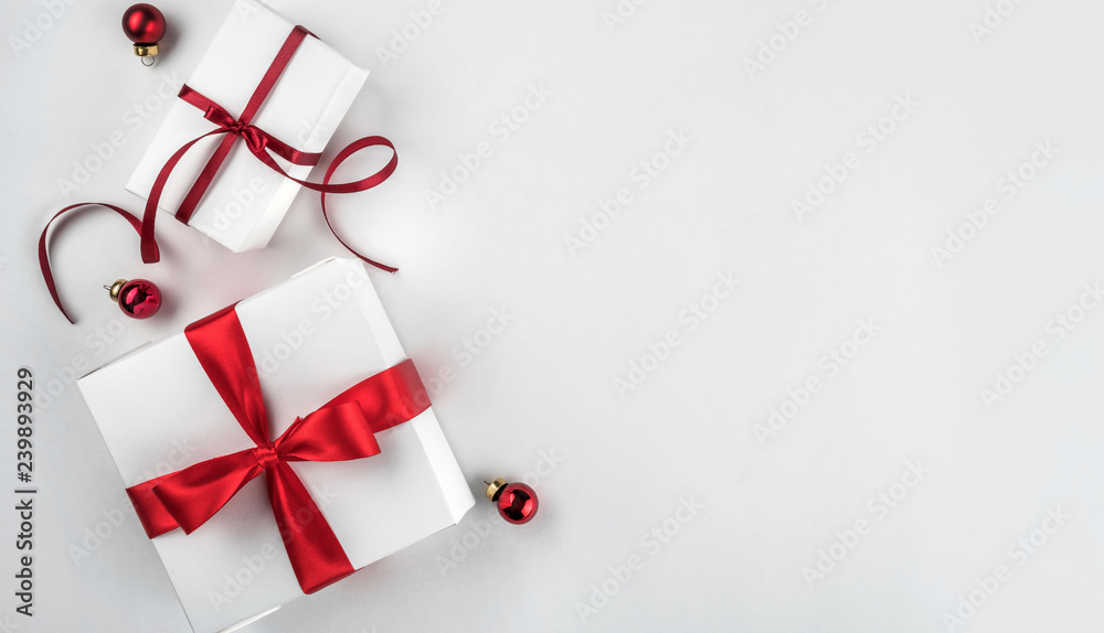 Christmas gift boxes with red ribbon and decoration on white paper background. Xmas and Happy New Year theme, bokeh. Flat lay, top view