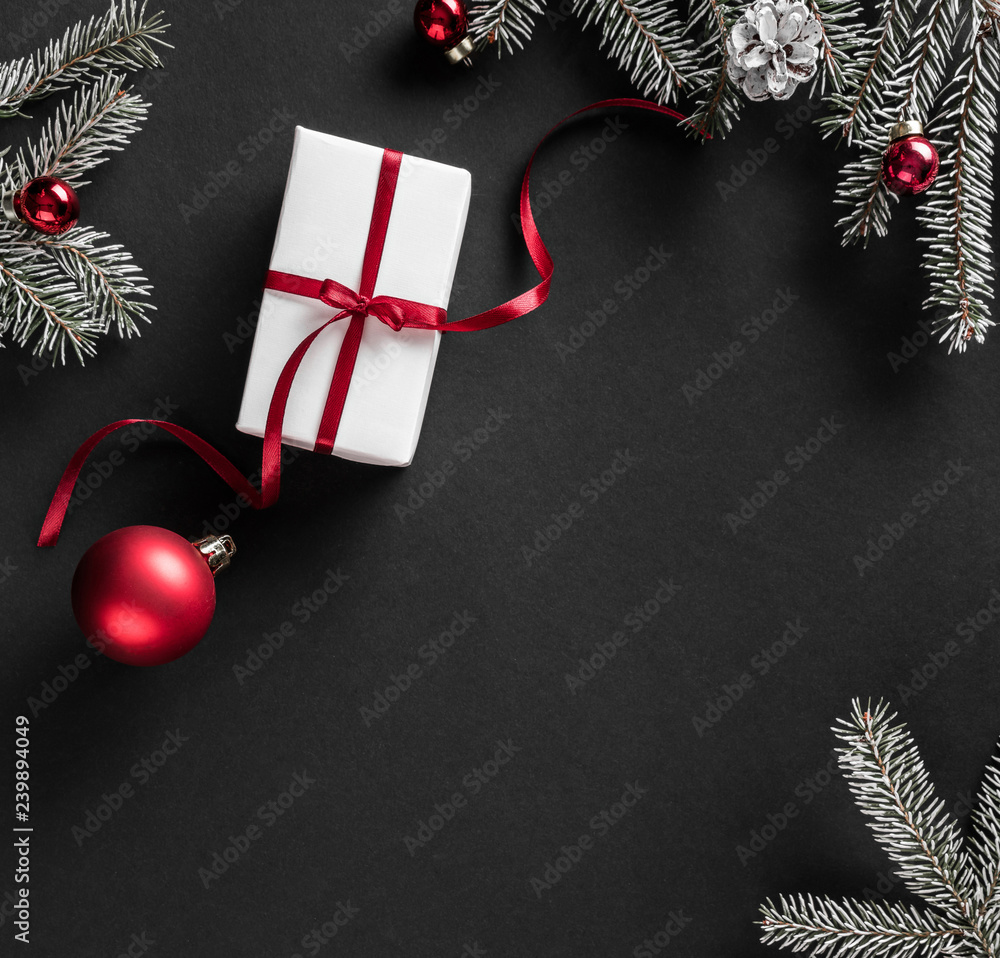 Creative layout frame made of Christmas tree branches, pine cones, gifts with red decoration on dark background. Xmas and New Year theme, snowflakes. Flat lay, top view