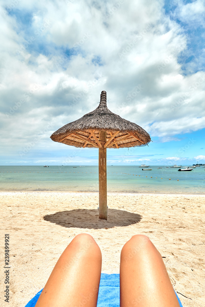 beautiful woman legs resting on the beach sunbathing with the horizon in the background