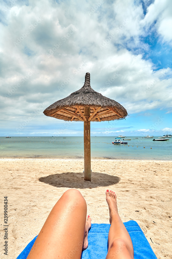beautiful woman legs resting on the beach sunbathing with the horizon in the background