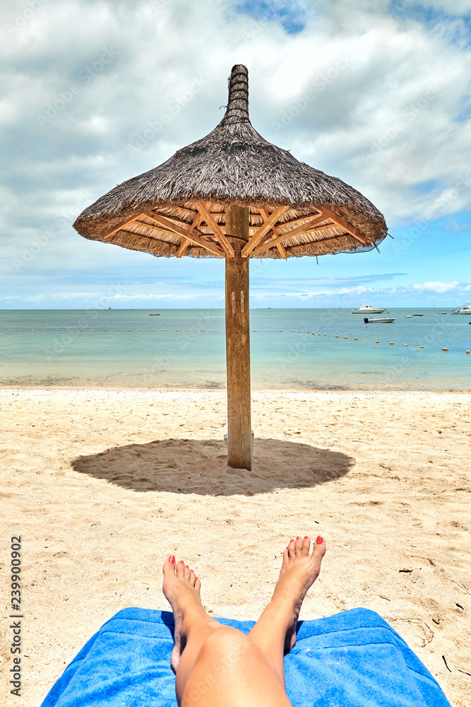 beautiful woman legs resting on the beach sunbathing with the horizon in the background