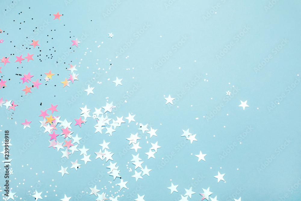 Silver and pink star glitter on blue pastel background. Festive concept. Place for design.