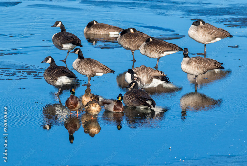 Canada geease and mallard ducks reflecting in blue water over ice, Iowa