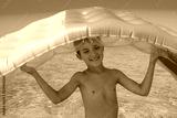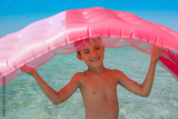 Cheerful boy holds an air mattress above his head.