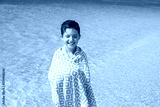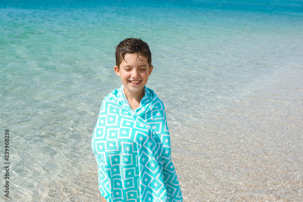 A cheerful kid on the beach wrapped in a bright beach towel.