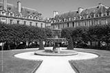Empty Place des Vosges in Paris in a sunny summer day, clear blue sky