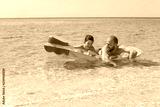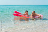 A happy father and son swim on an inflatable mattress on a sunny summer day.