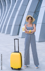 Young stylish Caucasian woman at the airport with a yellow suitcase and a straw hat.
