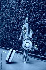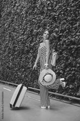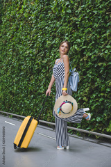 Young stylish Caucasian woman at the airport with a yellow suitcase and a straw hat.