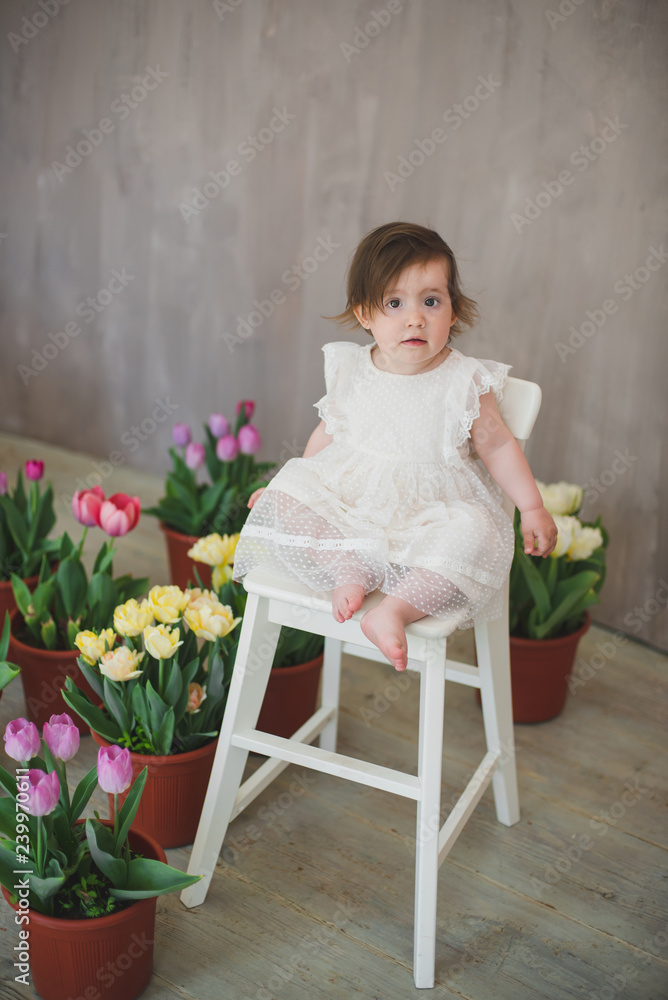Beautiful smiling baby girl among the tulips.