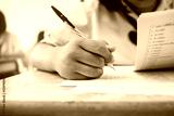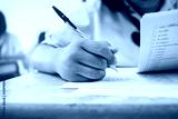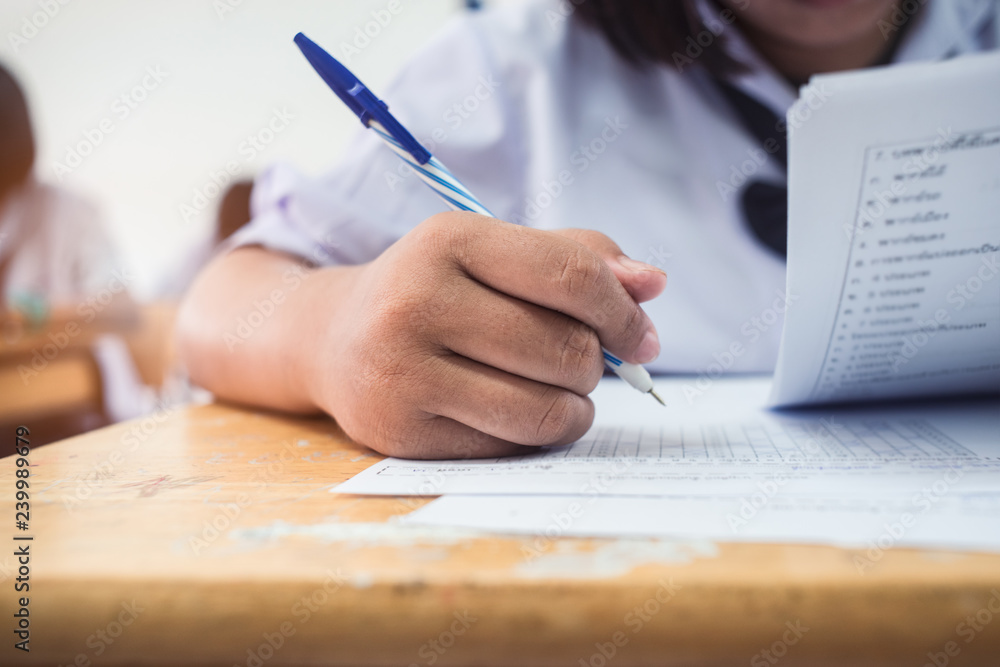 Close-up hand of students writing an exam in classroom with stress