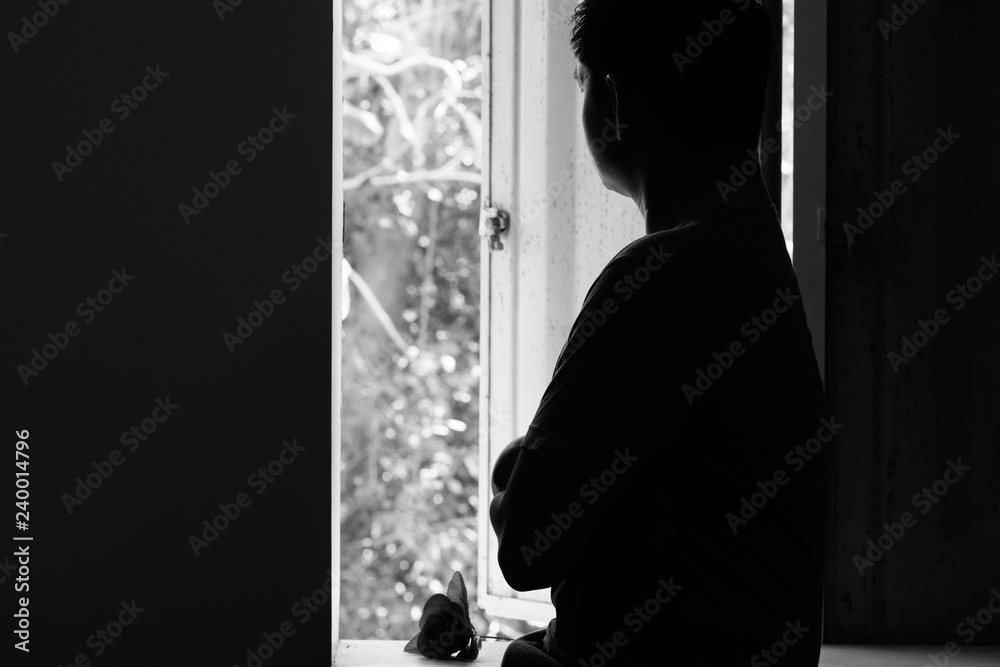Sad man thinking and looking from windows with rose in valentines day.B&W style