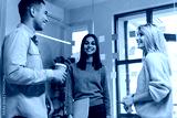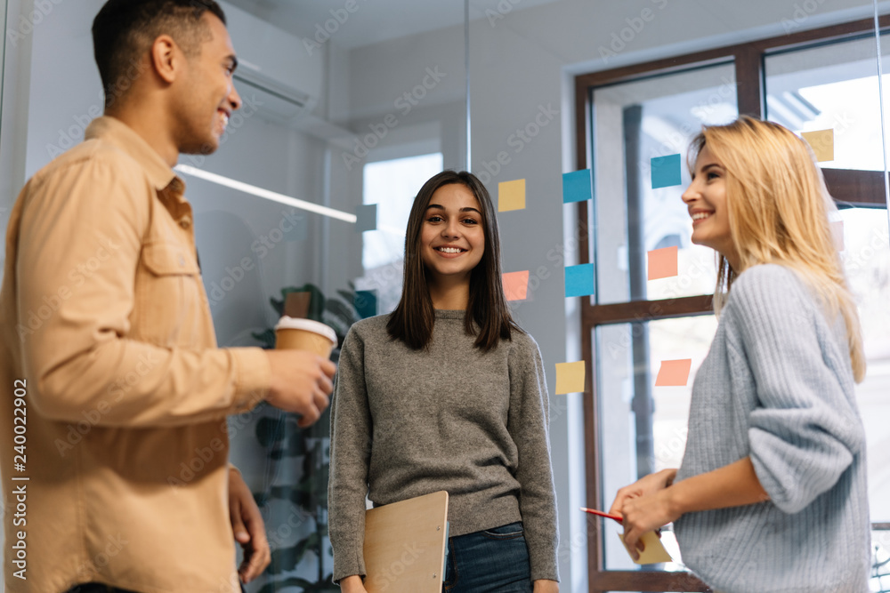 Multi ethnic group of university students studying, working project using scrum and sticky notes Meeting Collaborate Discussing Brainstorming Teamwork. Smiling friends learning language together.