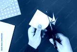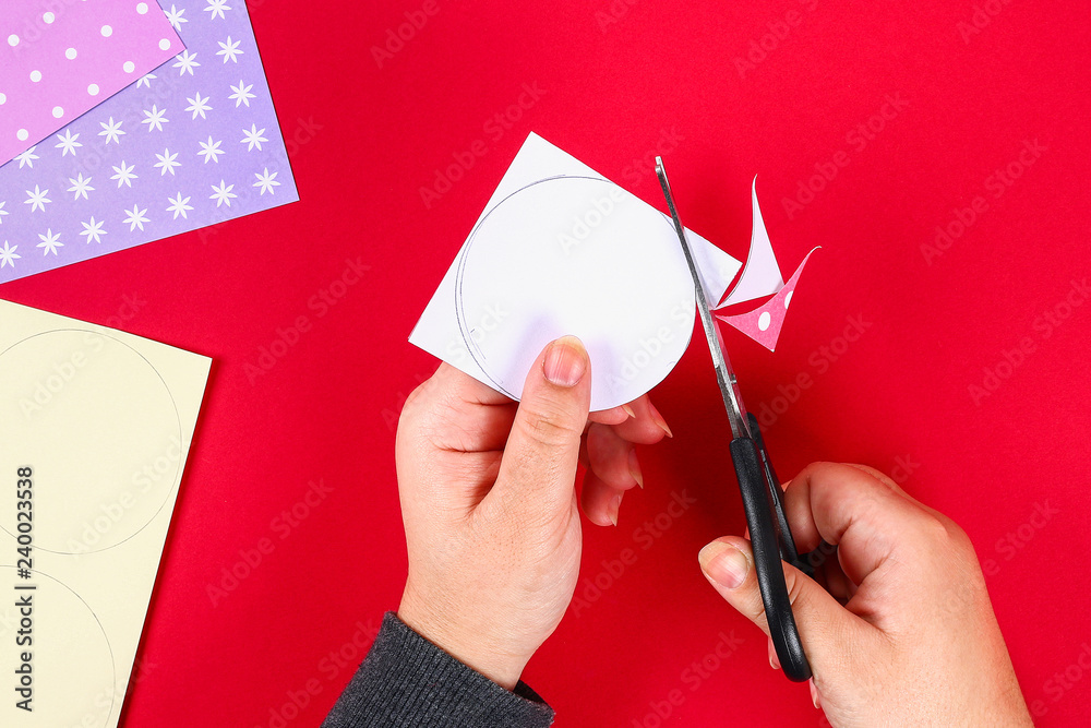 Diy cookie with predictions on a red background. Gift ideas, decor for Chinese new year. Handmade. Fortune cookies from a multi-colored cardboard. Step by step. process crafts. Top view
