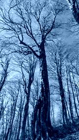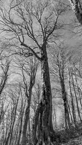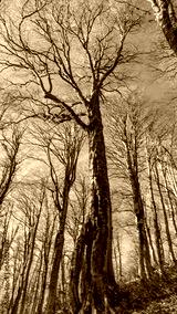 Big tall tree in autumn forest. Krasnaya Polyana, Russia.