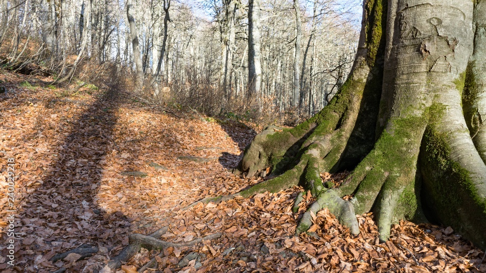 Roots of the thee in autumn forest. Krasnaya Polyana, Russia.