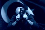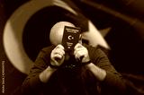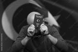 A detained Turkish citizen handcuffed with his passport in his hands against the background of the Turkish flag.