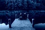 Couple of Asian Traveler on the Bamboo bridge beside the lake in the mist at morning sunrise at Pang Ung , Mae Hong Son province, Thailand