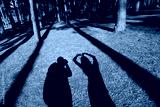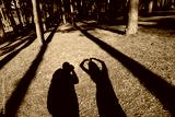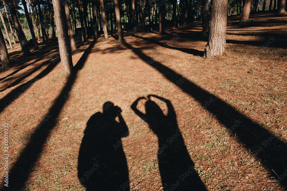 Shadow of Couple in Love on the floor among the tree. Pine tree forest in pan oung, Thailand