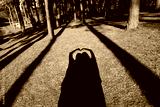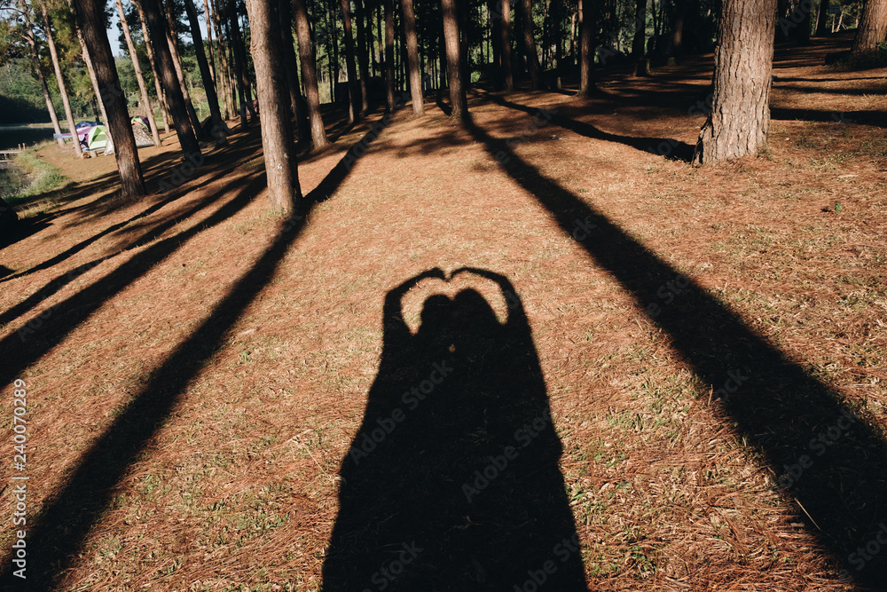 Shadow of Couple in Love on the floor among the tree. Pine tree forest in pan oung, Thailand