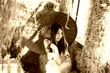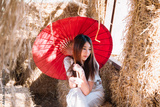 Beautiful woman holding red umbrella in the thai local Straw house. close the face.